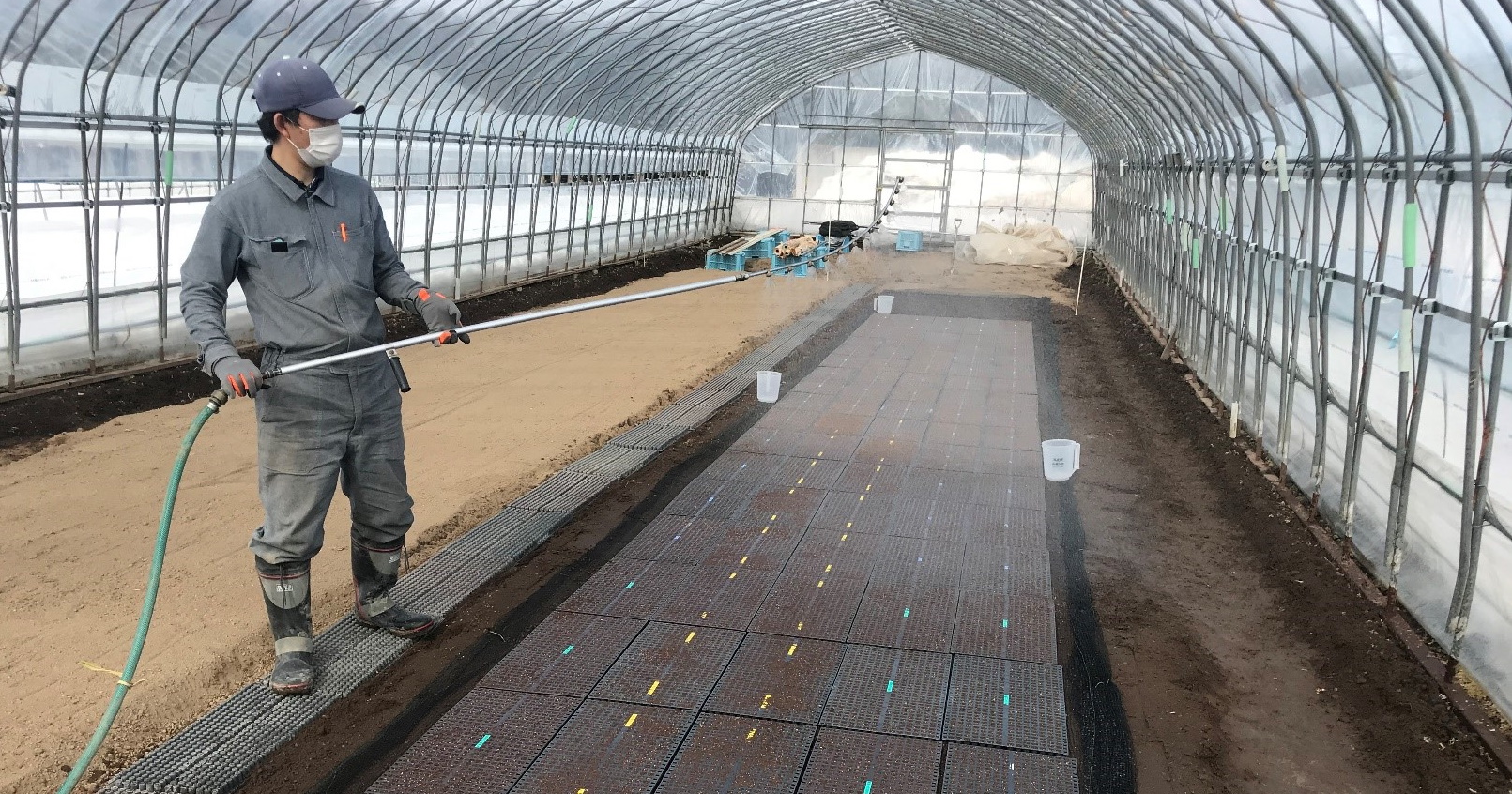 ビニールハウスの中で玉ねぎの床伏せ作業が開始しました!