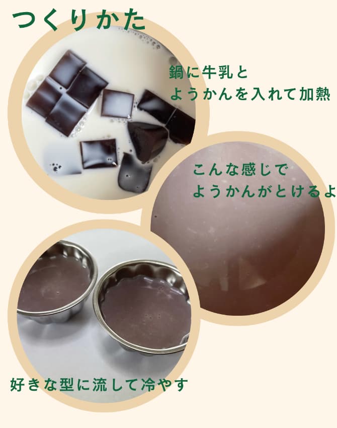 ①羊羹を角切りにし、牛乳と一緒に鍋に入れ、弱火にかけます。