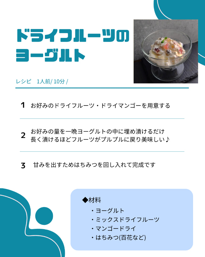 1.  ドライフルーツ・ドライマンゴーにヨーグルトを混ぜこみ一晩漬け込む